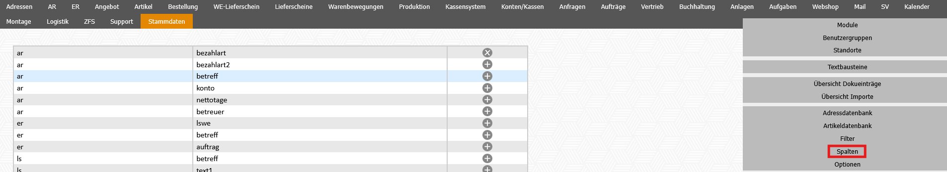 Modul Stammdaten - Spalten: