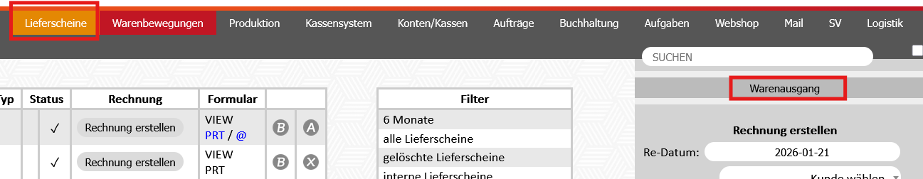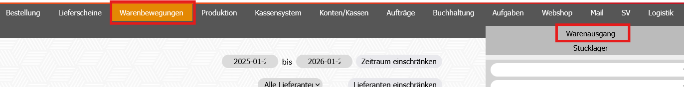 Um Bruch und/oder Verderb im System zu erfassen, steht der Warenausgangsschirm zur Verfügung. Dieser kann auf zwei Wegen aufgerufen werden: