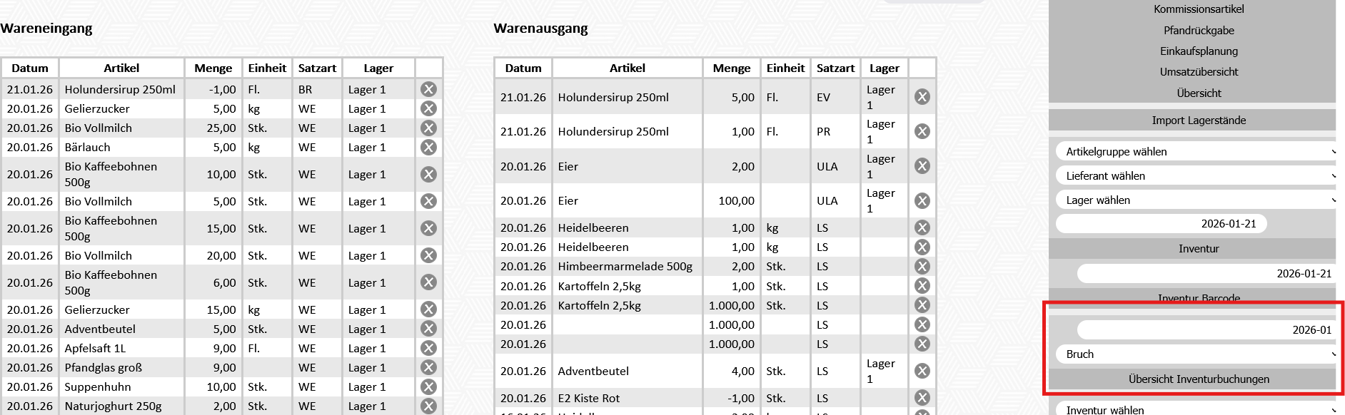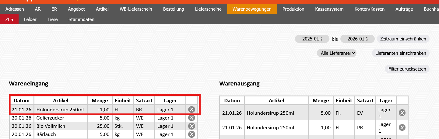 Im Modul Warenbewegungsübersicht (Modul Warenbewegungen) können die gebuchten Aritkel ebenfalls eingesehen werden