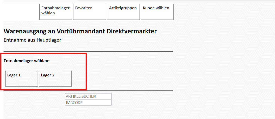 2. Wird mit einer Lagerführung gearbeitet, dann muss im nächsten Schritt das Entnahmelager ausgewählt werden.