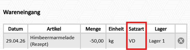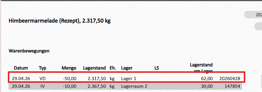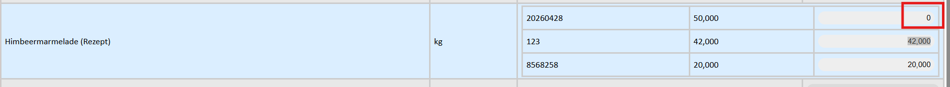 3. Ist eine Charge verdorben/zu Bruch gegangen,.. kann in der Spalte ganz rechts im Schirm der tatsächliche Lagerstand eingetragen werden (z.B. 50kg von Charge verdorben = 0 kg vorhanden)
