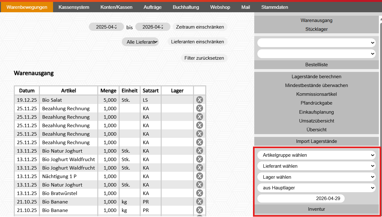 | Datumsfeld | Inventurschirm wird mit den Lagerständen, die zu diesem Tag vorhanden waren angezeigt. |