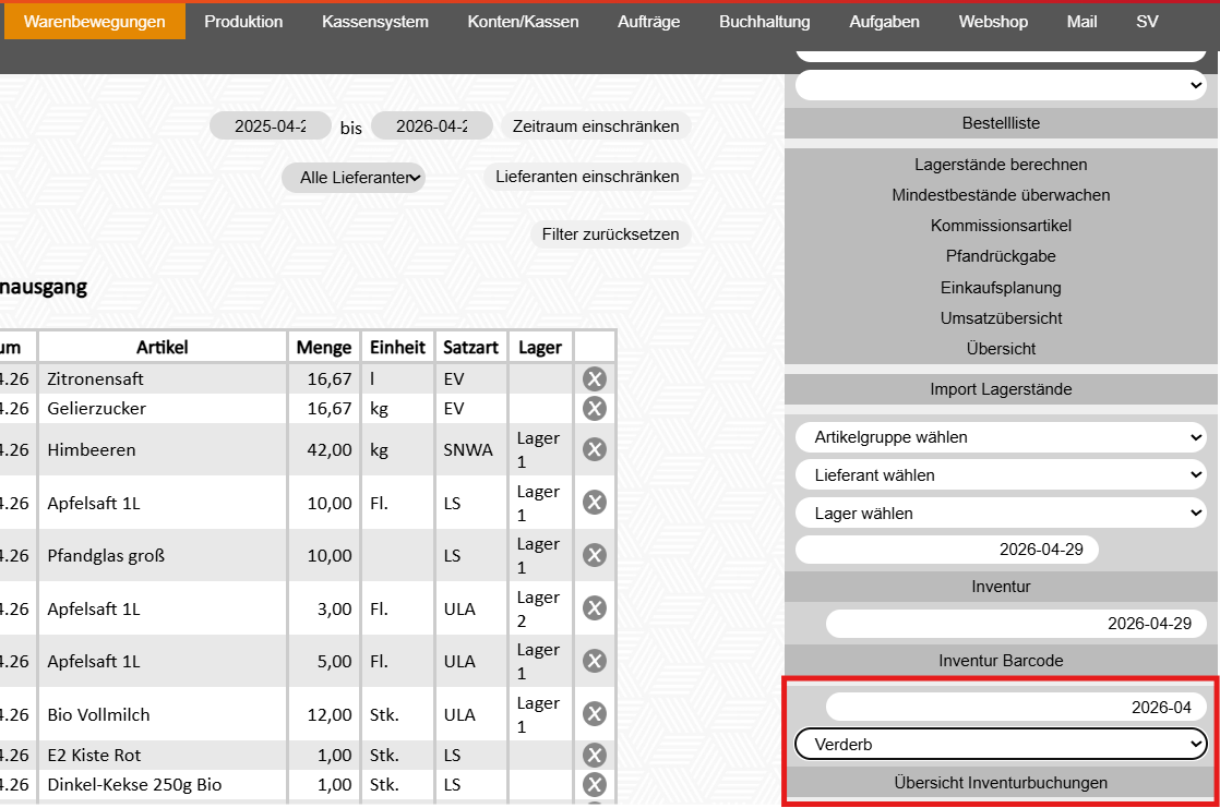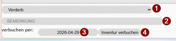 - Auswahl der Inventurmöglichkeit (Bruch, Verderb, Inventur,..)