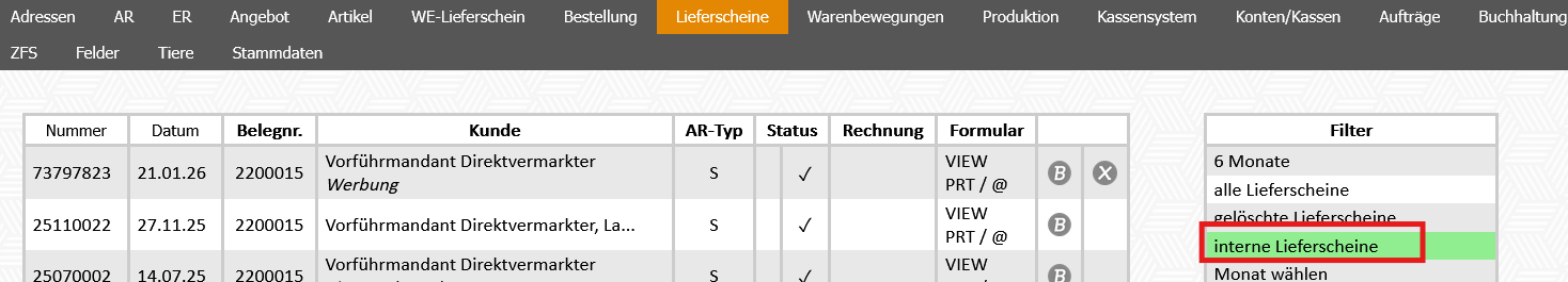 6. Modul Lieferscheine - Filter "interne Lieferscheine" - hier kann man alle internen Lieferscheine über Eigenverbauchs- oder Werbungsbuchungen einsehen