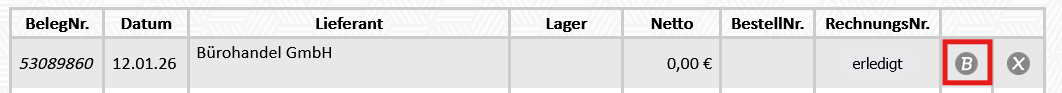 7. Möchte man einen Wareneingang nochmal rückgängig machen, klickt man auf "B" um den Wareneingang nochmal zu bearbeiten