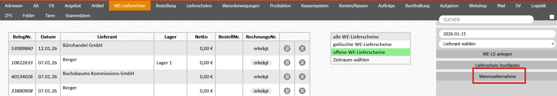 6. Der fertige Wareneingang wird nun im Modul WE-Lieferschein angezeigt