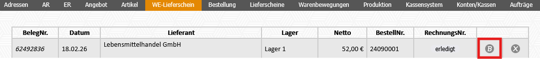 1. Modul WE-Lieferschein - erfassten Wareneingang durch Klick auf "B" (=bearbeiten) öffnen