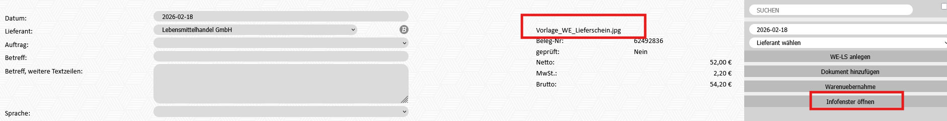 Die hochgeladenen Dokumente erscheinen über dem Feld "Beleg-Nr." Durch Klick auf den Button "Infofenster öffnen" können die Dokumente eingesehen werden.