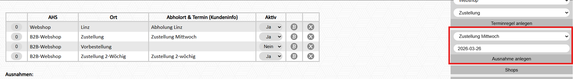 Soll über den gewünschten Webshop nur zu bestimmten Tagen bzw. Uhrzeiten bestellt und /oder geliefert werden können, müssen die Termine spezifisch eingegeben werden. Damit nicht jeder Termin einzeln eingegeben werden muss, können Terminregeln sowie Ausnahmen zu den einzelnen Regeln definiert werden.