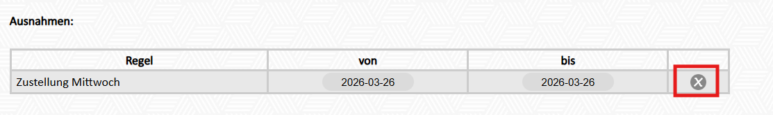 Ein Ausnahmesatz kann gewartet werden, wenn die angelegte Terminregel für einen gewissen Zeitraum nicht gelten soll.