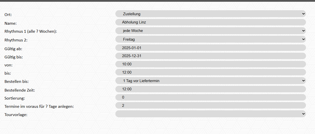 | Termine im voraus für ? Tage anlegen | Anzahl der Tage vor dem Abholtermin/Zustelltermin, an dem der Termin zum bestellen freigegeben wird |